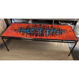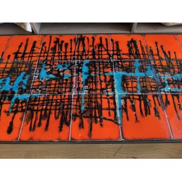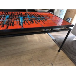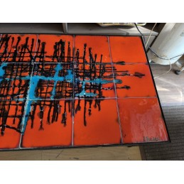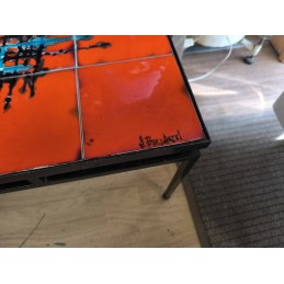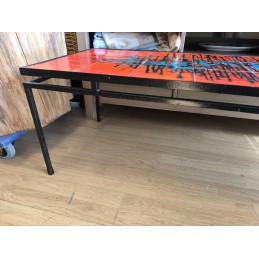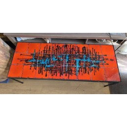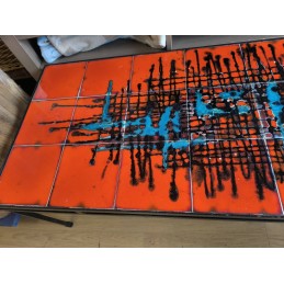 Table de salon vintage au style Mid-Century mordern avec un plateau en carreaux de céramique décorés et une structure en métal noir.
